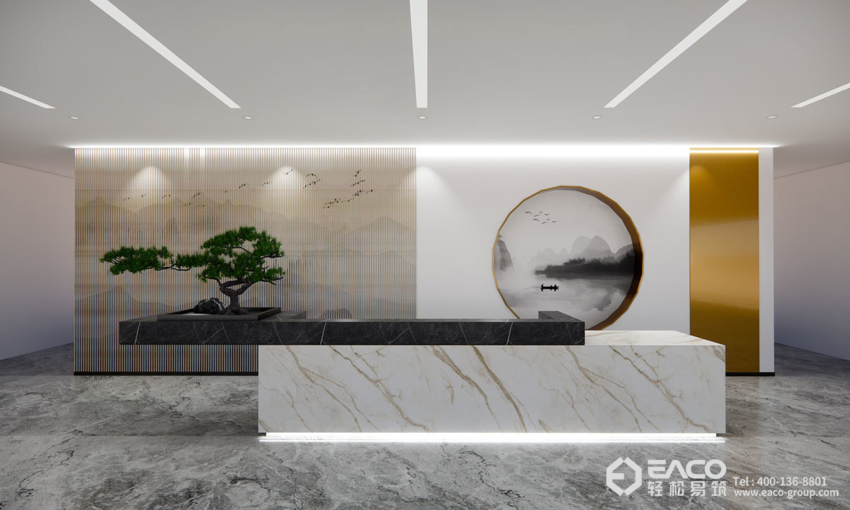 前台使用黑色与白色的大理石连接,用绿植作为点缀,创造出视觉具有吸引力却又不失内敛的空间属性。既有突破常规、打破了单一色彩的现代前卫感,又将中式传统的典雅柔美巧妙融合,张弛有度,展现出具有传统复古气息与现代时尚碰撞的美学艺术空间。
