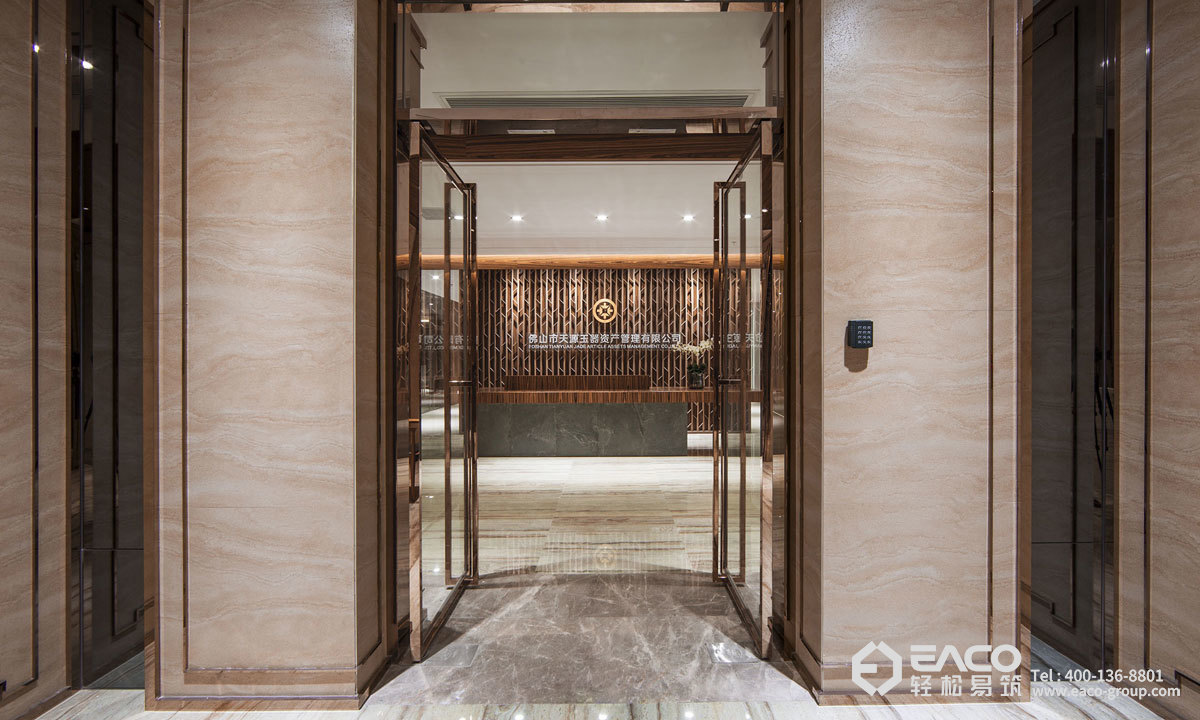 佛山市天源玉器资产管理有限公司位于佛山市南海区桂城平东昆岗西路,不断吸取和借鉴国内外先进的经营和管理理念,努力实现公司业务、管理等方面自我超越,本案是其办公空间设计装修项目,总建筑面积为1000㎡。