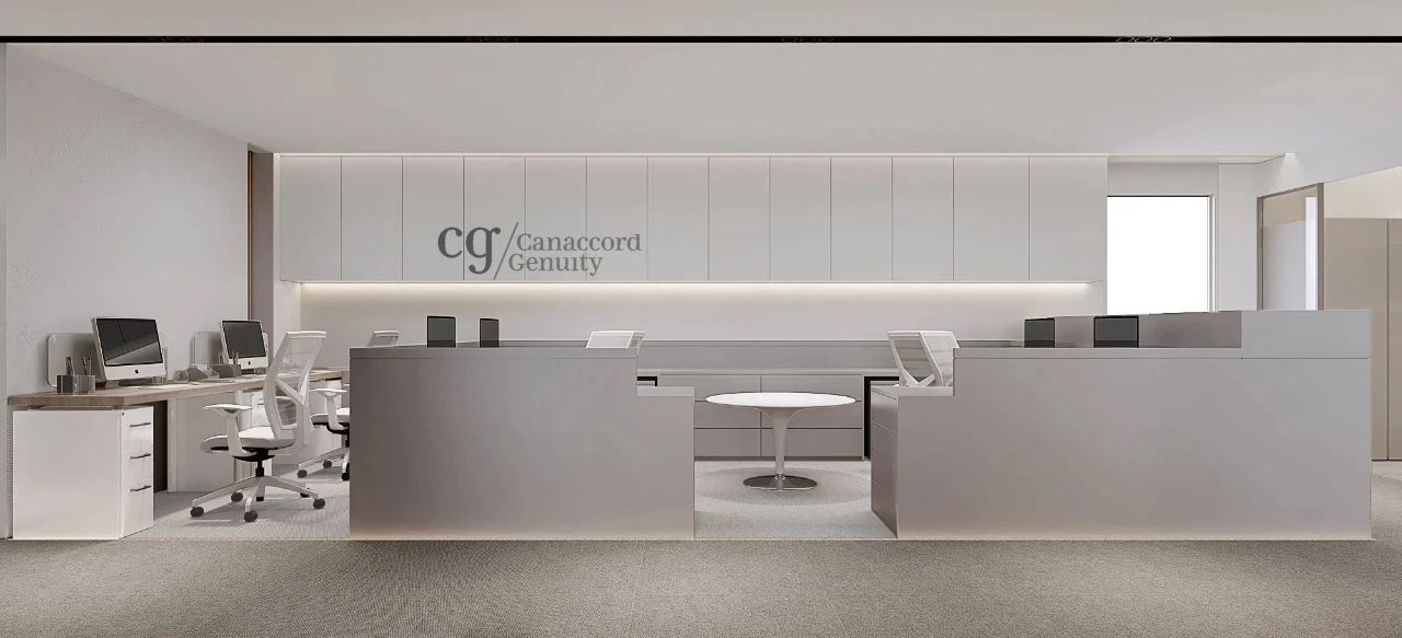 该办公室装修在设计和材料选择上,整个空间以白色为基调,搭配低调大气的胡桃色办公桌,细腻温润的材料肌理与金属皮质相互交织,营造出一个简约干练、充满商务精英气质的高级空间。