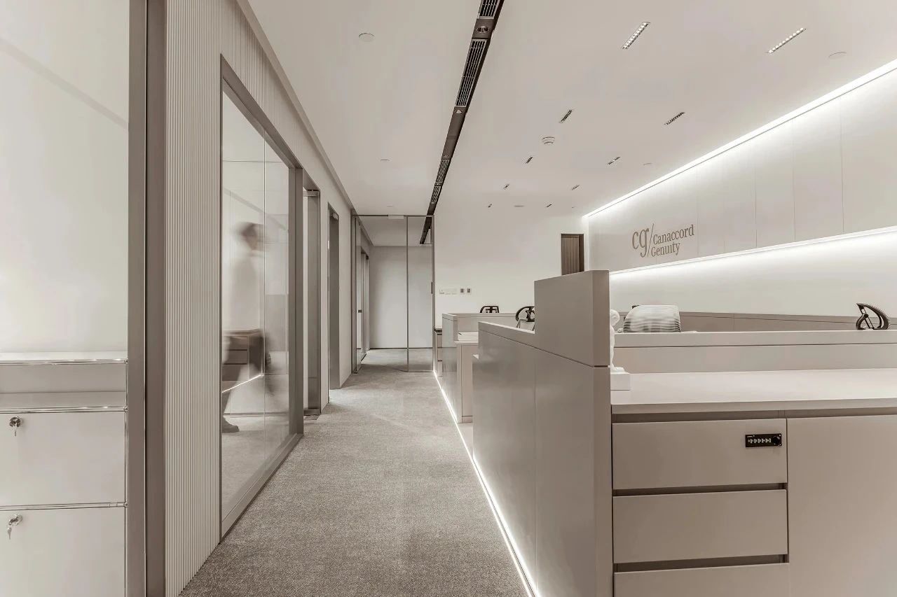 在空间功能布局上划分了三个区块,办公区、会议区、洽谈区。设计中优先考虑空间连接和效率提升,设计师通过优化空间动线,从接待到会议室再到办公室,使不同的工作环境之间平滑过渡又互不影响。