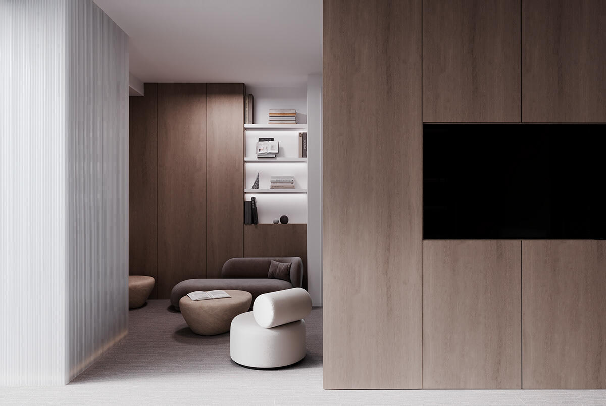 在空间布局上,摩卡慕斯色墙面与浅色地板搭配,营造出层次感。局部采用深色家具点缀,既保持整体协调,又突出重点区域。
